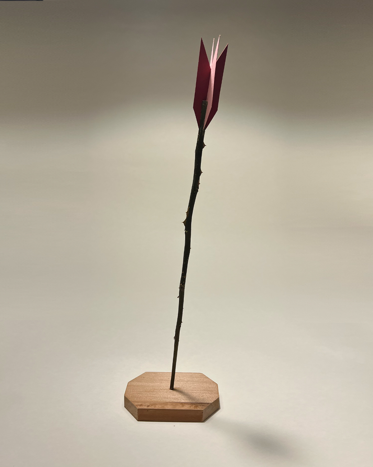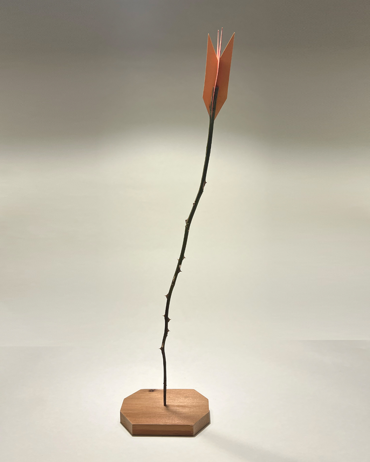 Arrow sculptures in celebration of Valentine’s Day. Base is cedar, fletching is paper. The shaft is made from the dried stems of roses with the thorns still intact. My intention is what I call “sensory distraction” depriving the viewer of the sense of touch, but triggering the mind to think about how it would feel if you did. Working with roses at Park Deli, I get stabbed by thorns constantly, being reminded of the pain that one must go through to enjoy beauty. Edition of six, signed, numbered and cataloged Aprox 18-21" tall, base 3.5 x5"